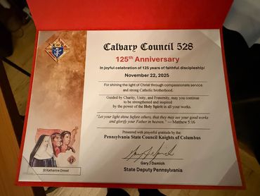 The Knights of Columbus is a Catholic Fraternal Order that strengthens the ideals we hold true through Practice of Charity, Unity, Fraternity and Patriotism. Calvary 528 is part of the Pennsylvania State Council and together shares a message that all life is sacred and comes from God.